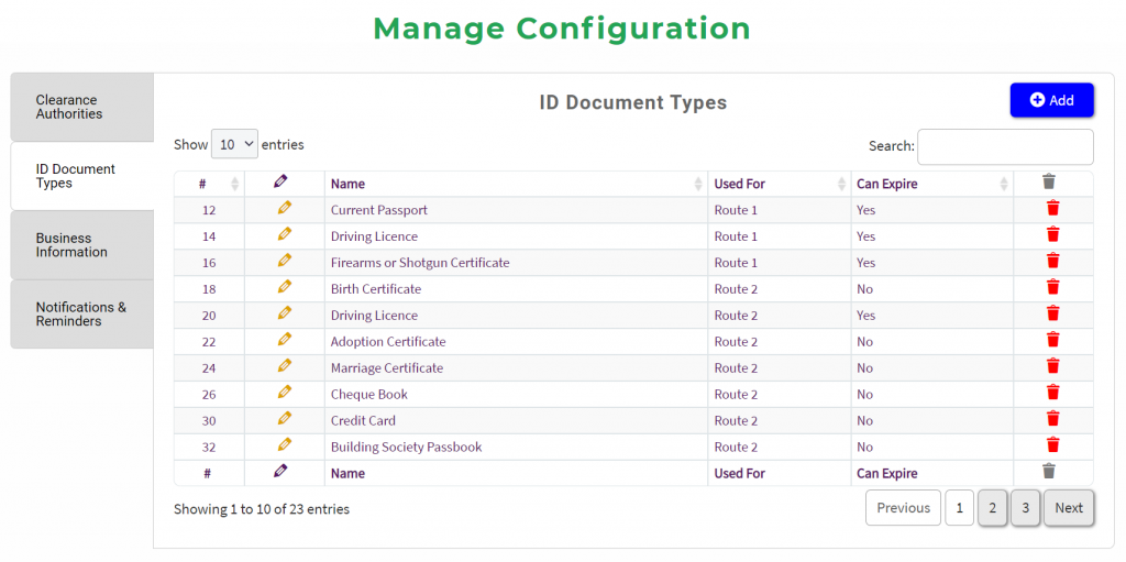 eVett offers Vetting Users the option to modify certain system settings.  For example, you can configure which types of identification documents you will accept from Applicants, or what Clearance types you will allow Applicants to apply for.