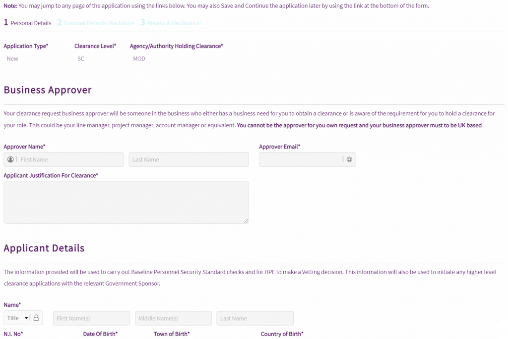 The Workflow Module is an optional feature that provides an interactive web based interface for your Applicants to follow. The workflow is unique to the nature of the application: for example, if just a Higher Clearance is requested, only the questions relevant to that clearance are asked. If a Transfer is required, the flow will change to query the relevant details of the existing Clearance and Sponsor.